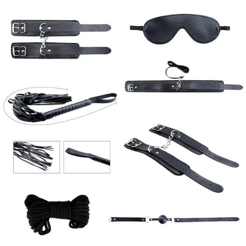 Alive Secret Desires Kit: bondage de iniciación con 7 piezas esenciales. Antifaz, esposas, látigo y accesorios negros para explorar dominación y sumisión en pareja.