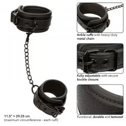 Las Nocturnal esposas de tobillo cuero ajustable negro de Calexotics están diseñadas para proporcionar una sujeción firme y un confort excepcional en tus juegos BDSM. Fabricadas en cuero sintético de alta resistencia con doble costura, estas esposas combinan durabilidad y suavidad. Cada correa es ajustable para adaptarse a diferentes tamaños de tobillo y se asegura mediante hebillas metálicas robustas. La cadena de metal resistente conecta ambas esposas e incluye anillos en D giratorios para máxima versatilidad.