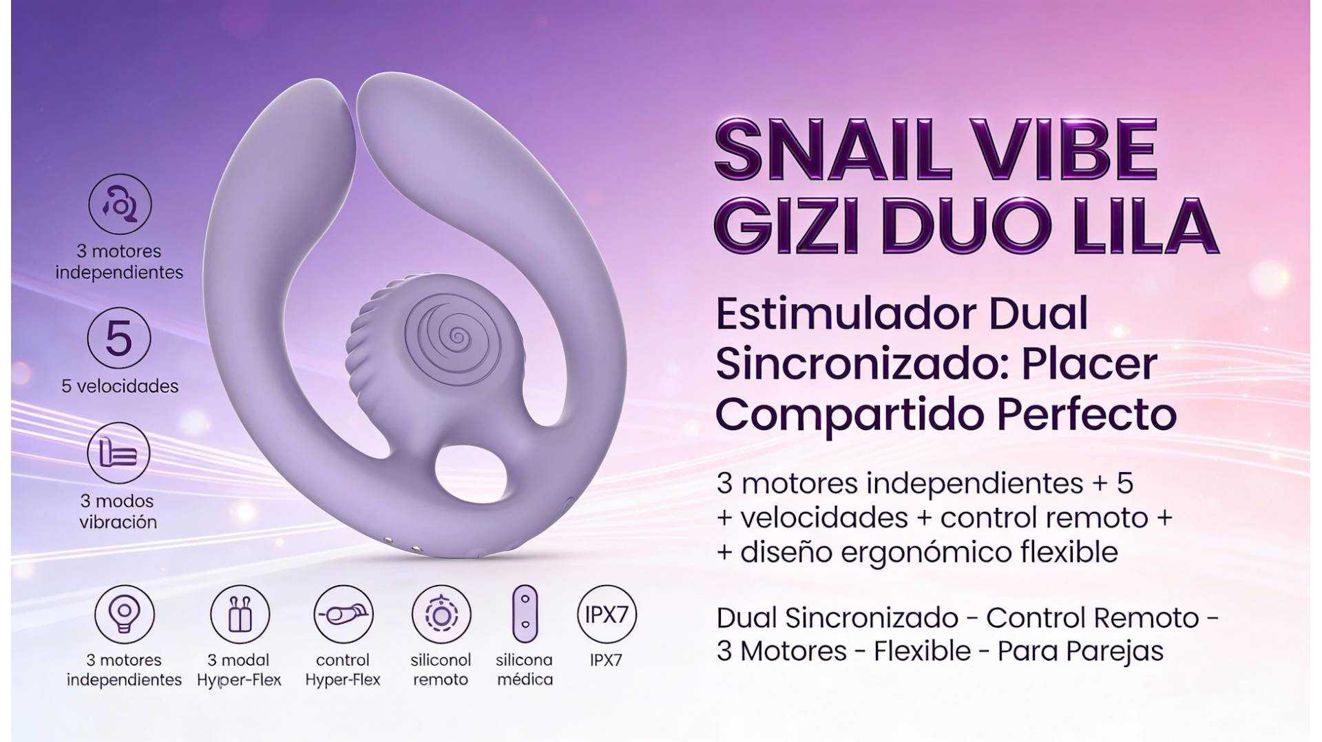 El Snail Vibe GIZI Duo representa maduración de categoría estimuladores pareja. No es simplemente "dos vibradores juntos"; es producto resultado de investigación profunda sobre dinámicas corporales de pareja. Tecnología Hyper-Flex, tres motores independientes, control remoto interactivo, y diseño inclusivo crean experiencia verdaderamente revolucionaria.